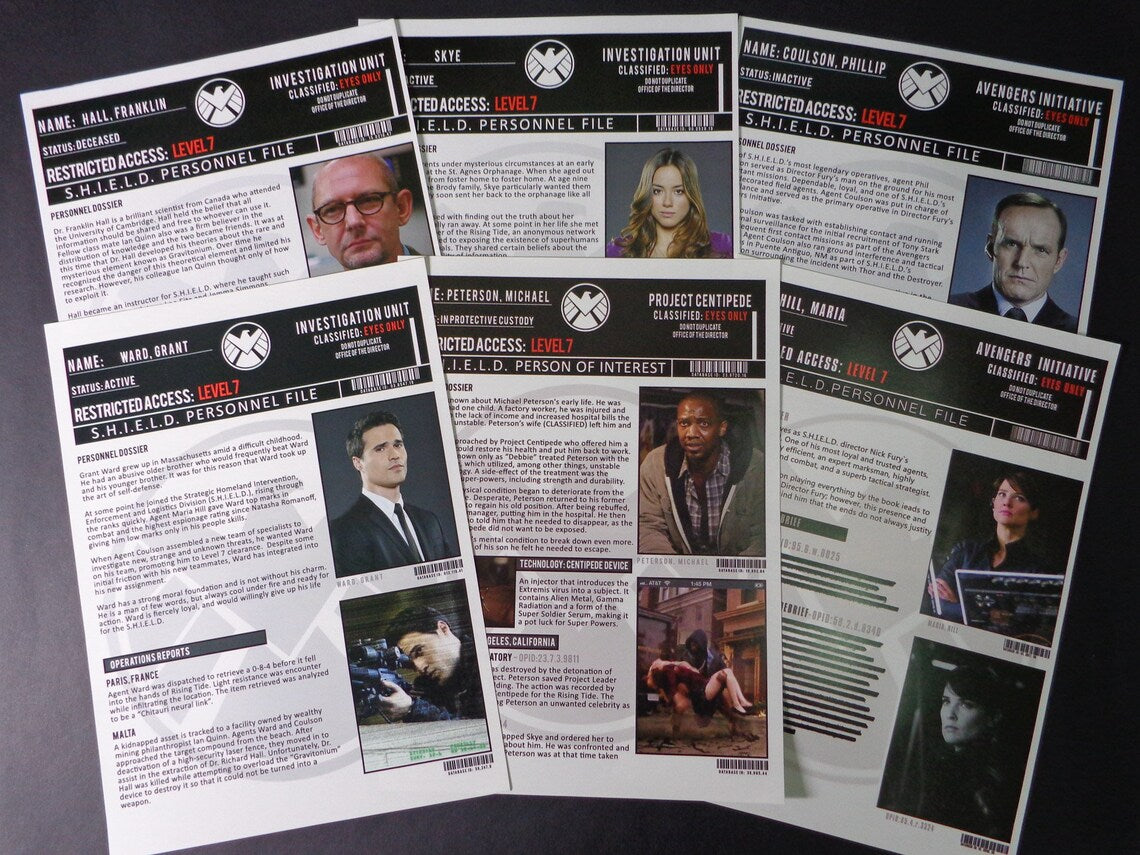 - 6 personal secret files of S.H.I.E.L.D. agents, including Agent Phil Coulson, Grant Ward, Maria Hill, Skye, Michael Peterson, Franklin Hall.