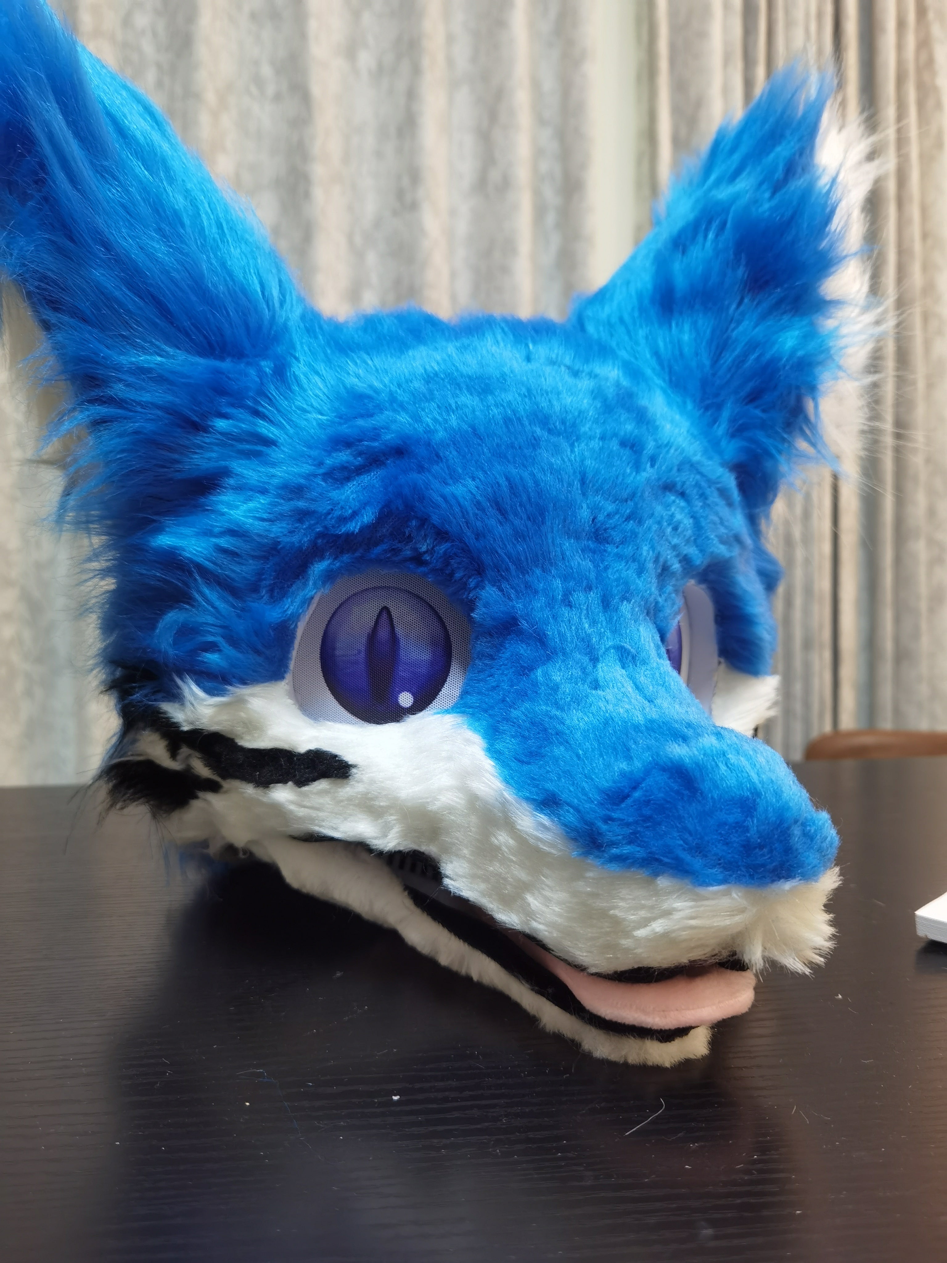 This handcrafted blue wolf fursuit head features a detailed wolf head design with default tracking eyes and hand-sewn ears. The base includes an adjustable helmet liner (60cm head circumference) with a rotary knob for size adjustments, ensuring a comfortable fit.