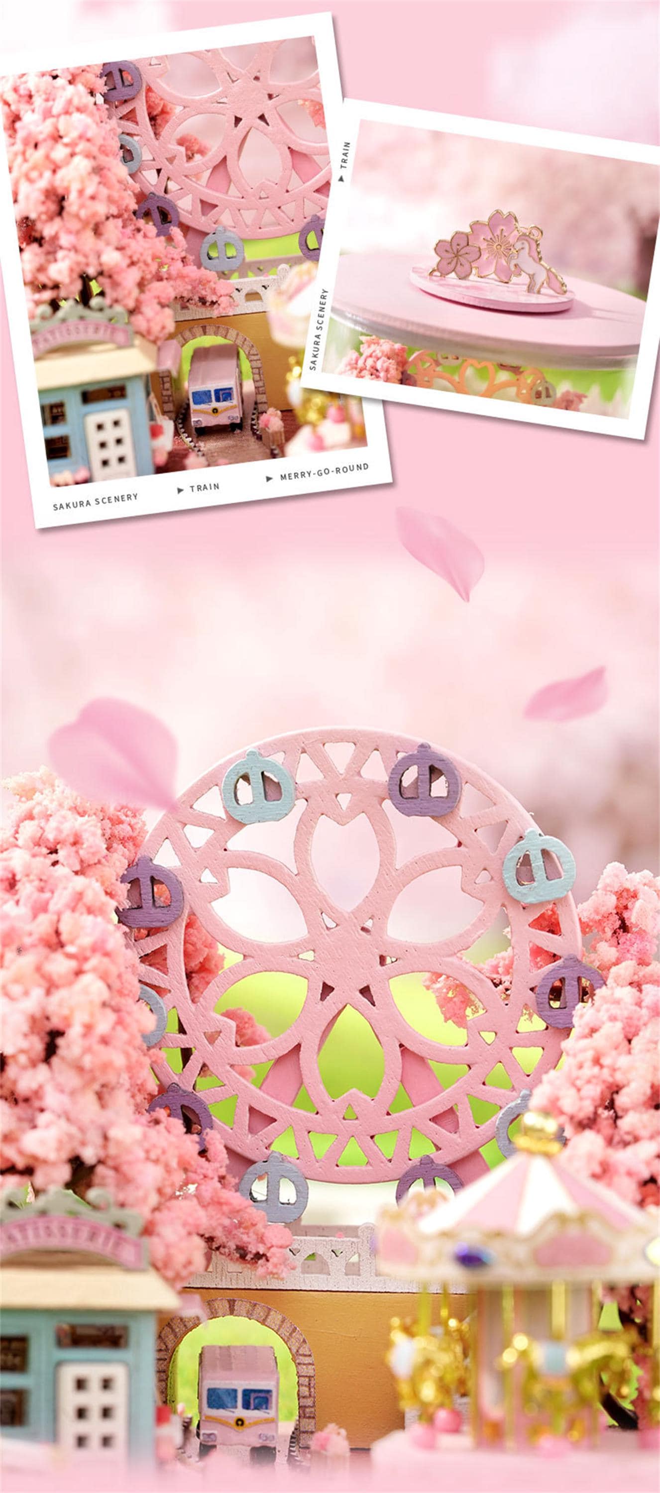 Sakura-Themed Wonderland: A beautifully crafted scene with pink cherry blossom trees, a delicate carousel, and a Ferris wheel.