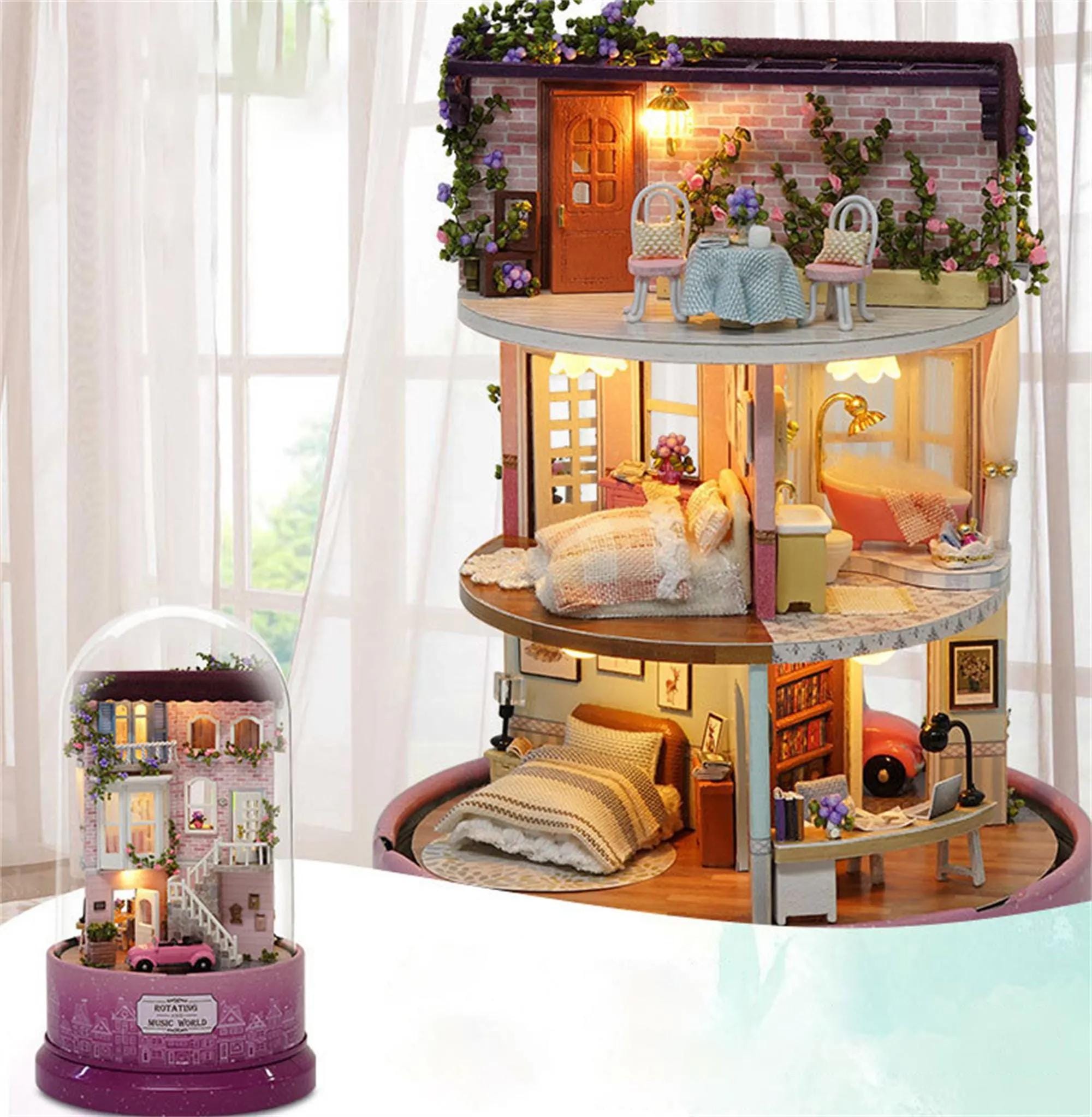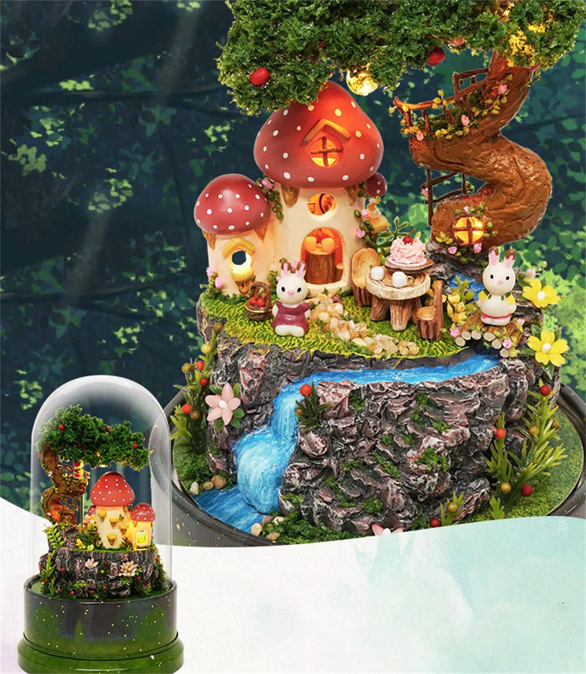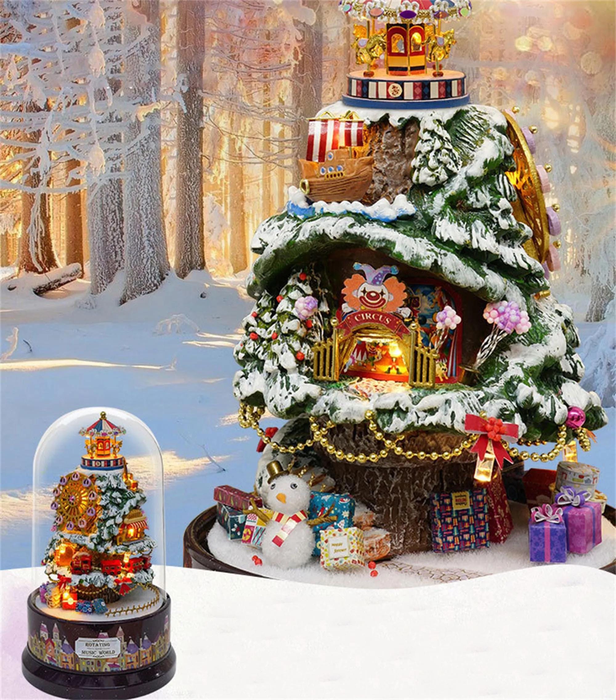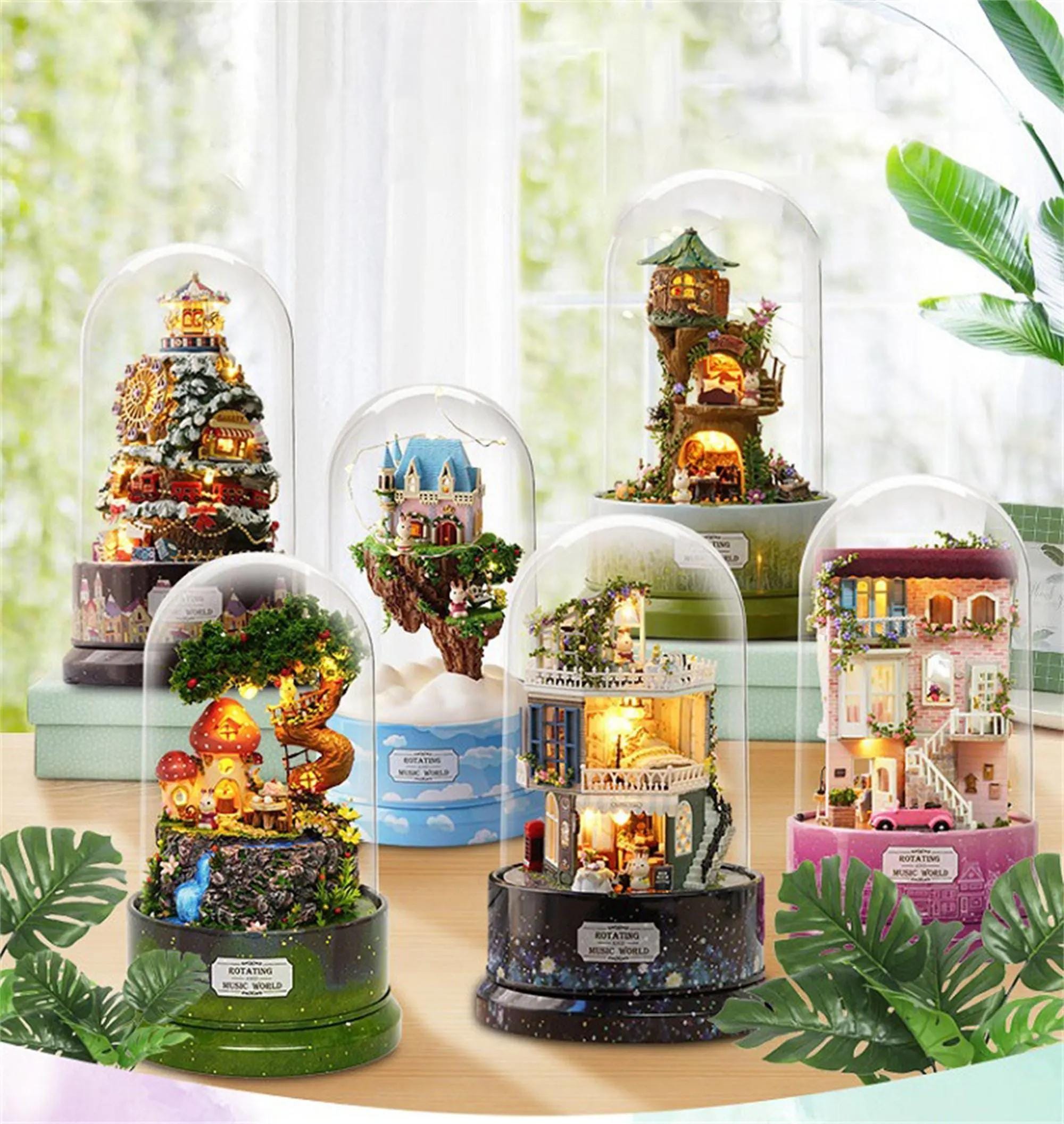 Whether it's a snowy Christmas house, a blue castle floating on clouds, or a little cottage in the woods, all the scenes are encased in a transparent glass dome, adding both charm and elegance.