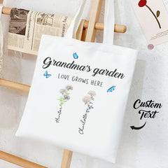 Carry your love for your grandkids with this fun and quirky personalized tote bag. Featuring your birth month flowers and your grandkids' names, it's the perfect gift for grandma to use in her garden or on the go. A unique and thoughtful present that will surely make her smile!