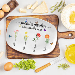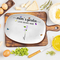 Welcome to Mom's Garden! This personalized platter features beautiful birthday flowers, making it a thoughtful gift for Mom. With vibrant colors and a floral motif, this plate is both elegant and personal. Bring joy and charm to any meal with this special addition.