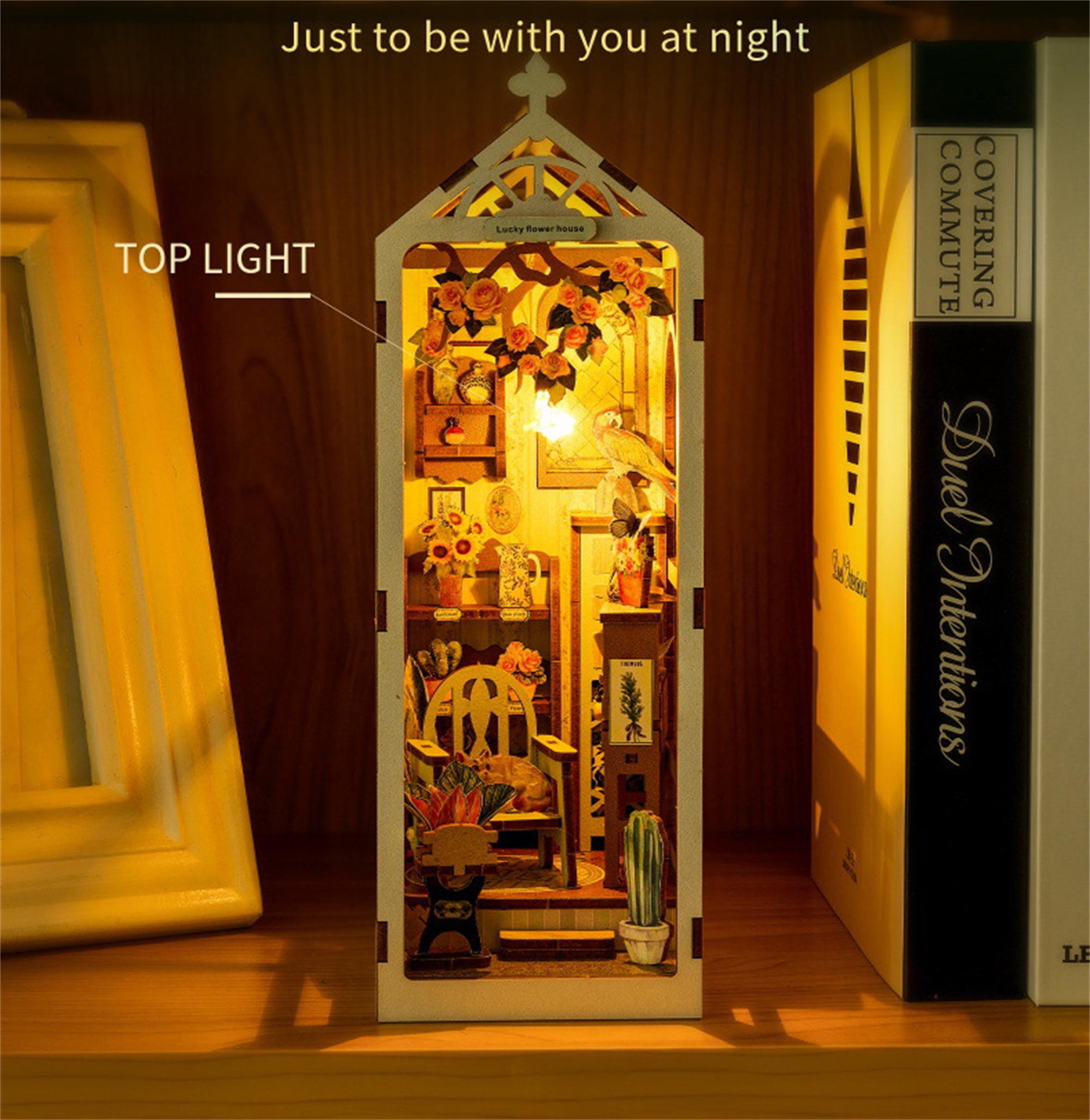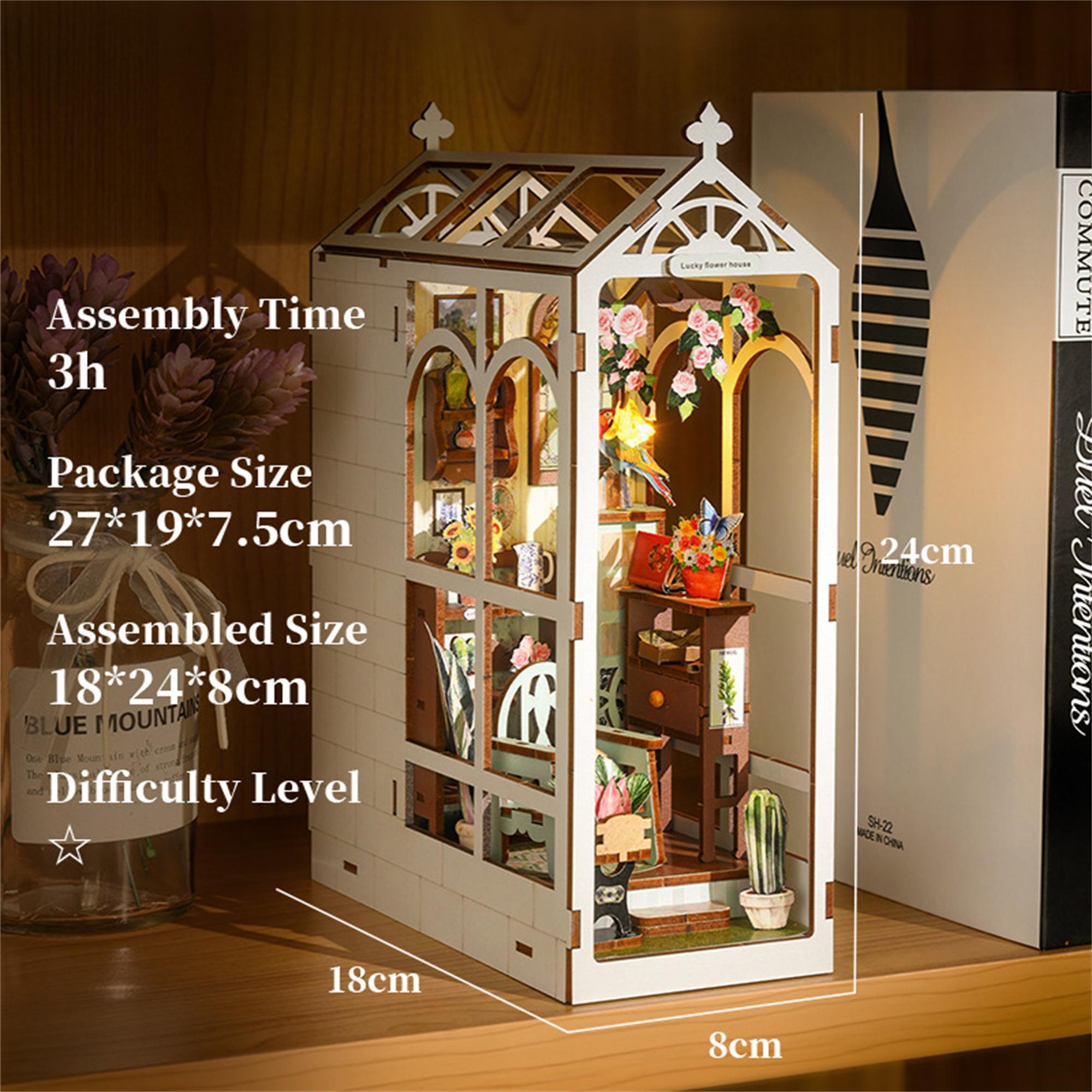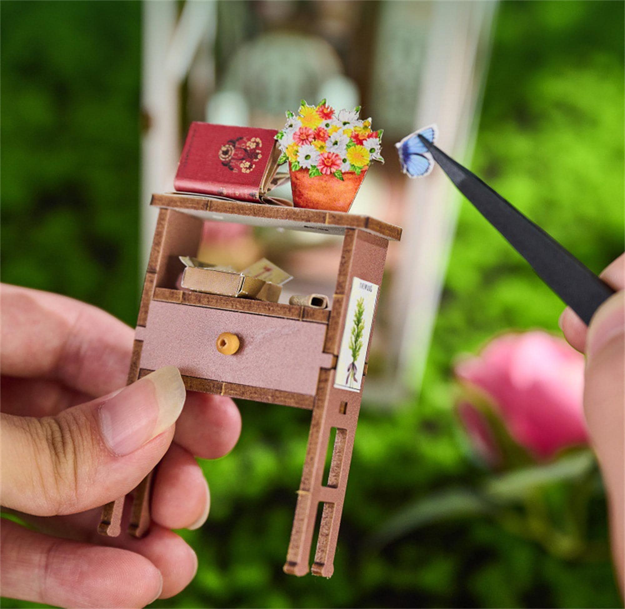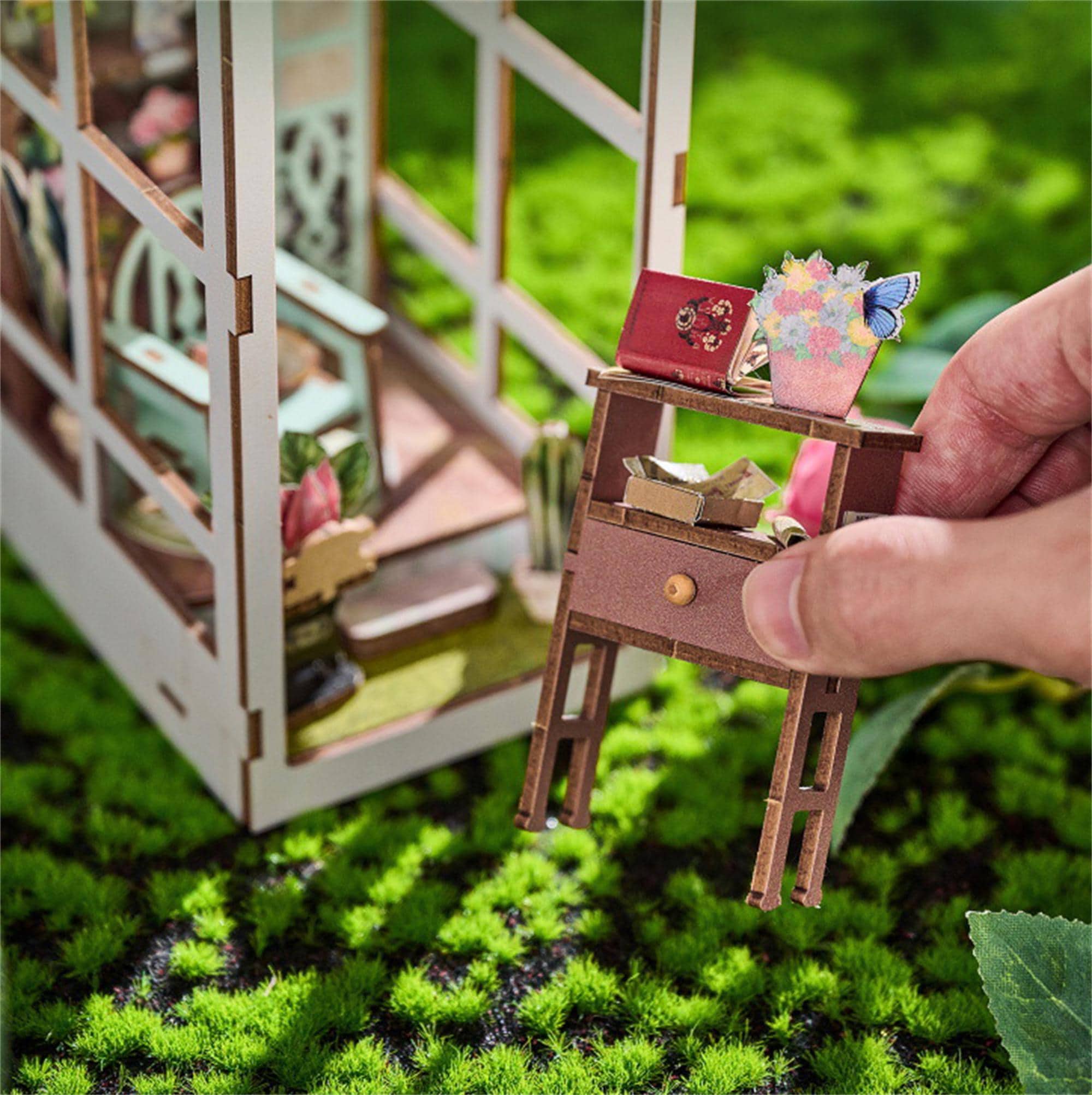 The exterior of the booknook is styled like a classic greenhouse, with large arched windows that allow you to peer into the delightful garden scene within. The structure is made from high-quality wood, laser-cut with precision to create intricate details that add to the overall charm of the piece. Inside, the garden is brought to life with colorful flowers, potted plants, and garden tools, all meticulously handcrafted to create a lifelike appearance.