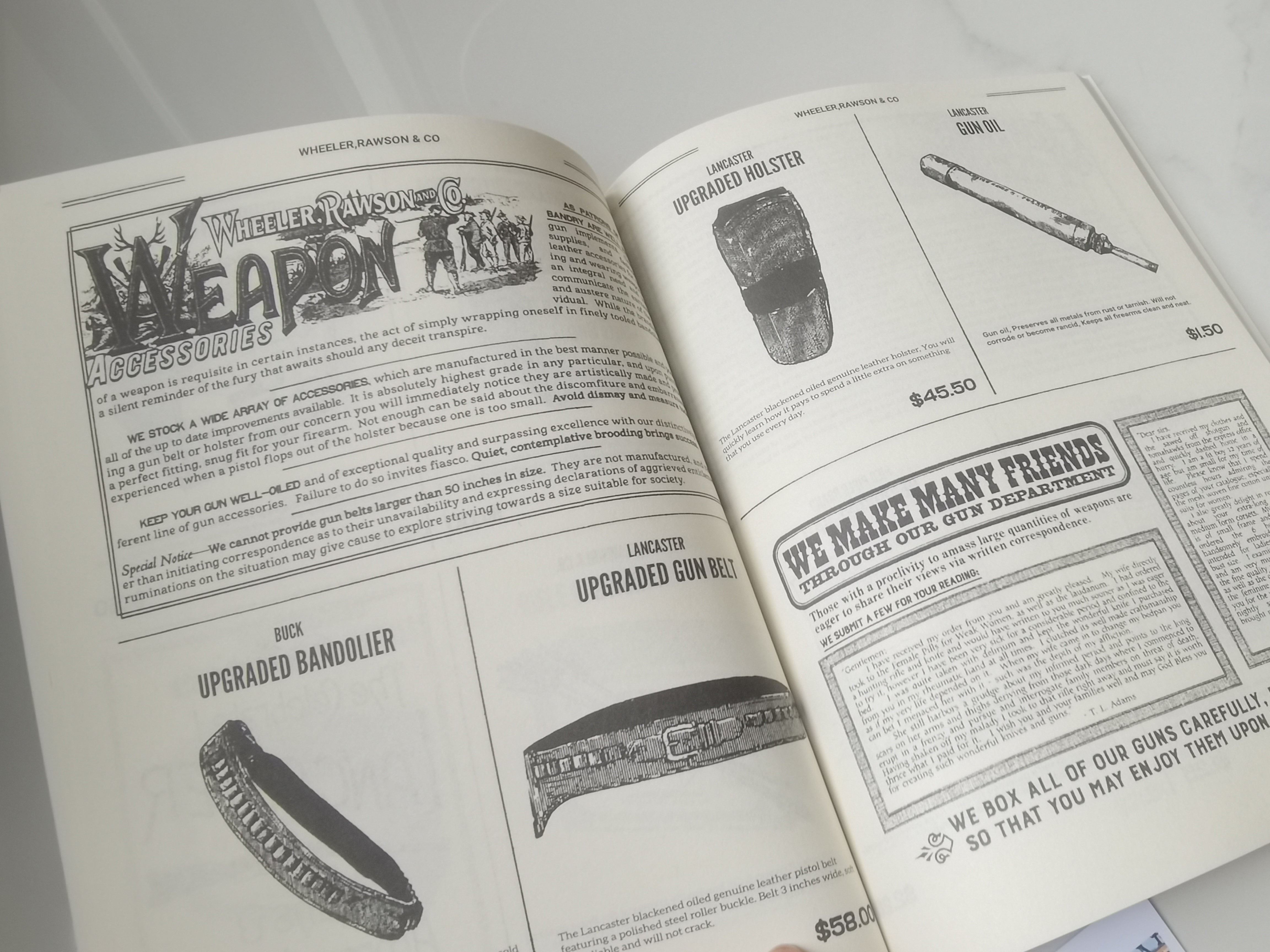 The Wheeler Rawson and Co. Catalog from rdr2 is a great addition for fans. The book size is 6.57 inches x 8.94 inches and has 126 pages.